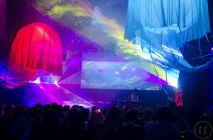 Diese Riesenqualle ist an einem permanent laufenden Lüfter abgeschlossen und bläst sich von selbst auf. Der Bläser macht ein leichtes-mittellautes Geräusch.